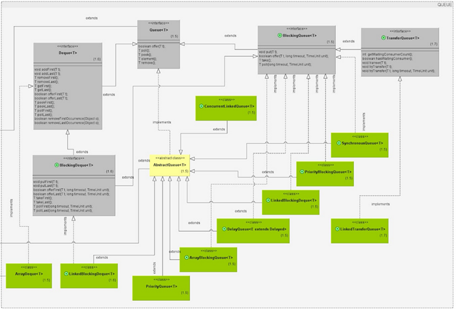 Queue和Deque接口继承Collection接口,实现FIFO(先进先出)的集合。二者的区别在于,Queue只能在队尾入队,队头出队,而Deque接口则在队头和队尾都可以执行出/入队操作