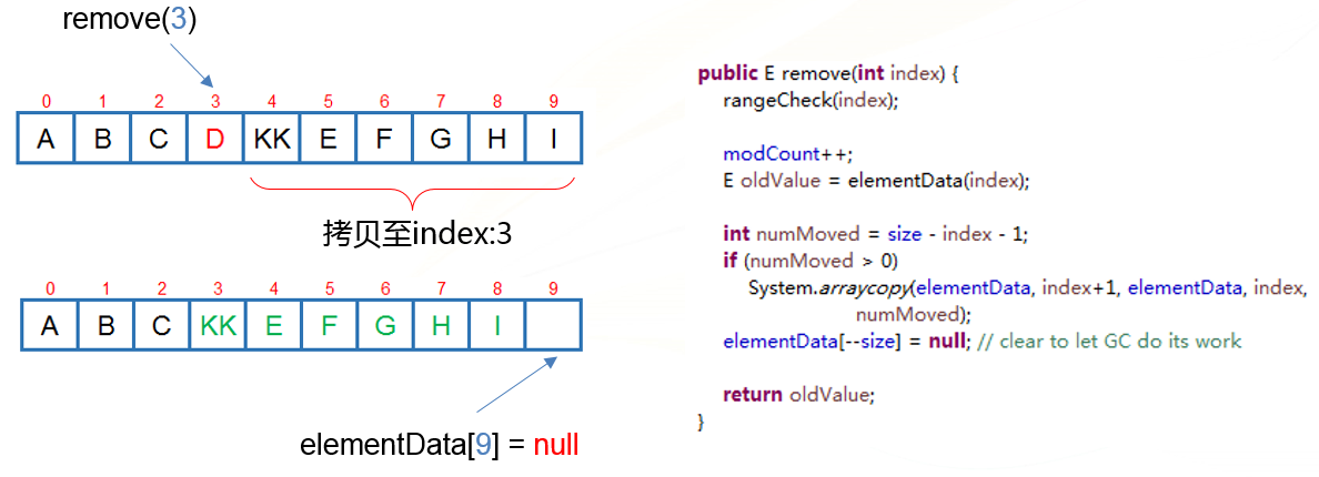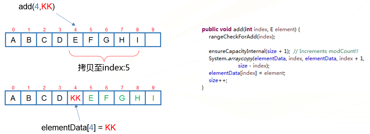 ArrayList使用数组拷贝来实现指定位置的插入和删除: