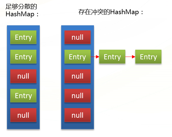 由每个Entry中的key的哈希值决定该Entry在数组中的位置。以这种特性能够实现通过key快速查找到Entry,从而获得该key对应的value。在不发生哈希冲突的前提下,查找的时间复杂度是O(1)。