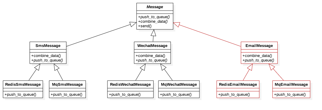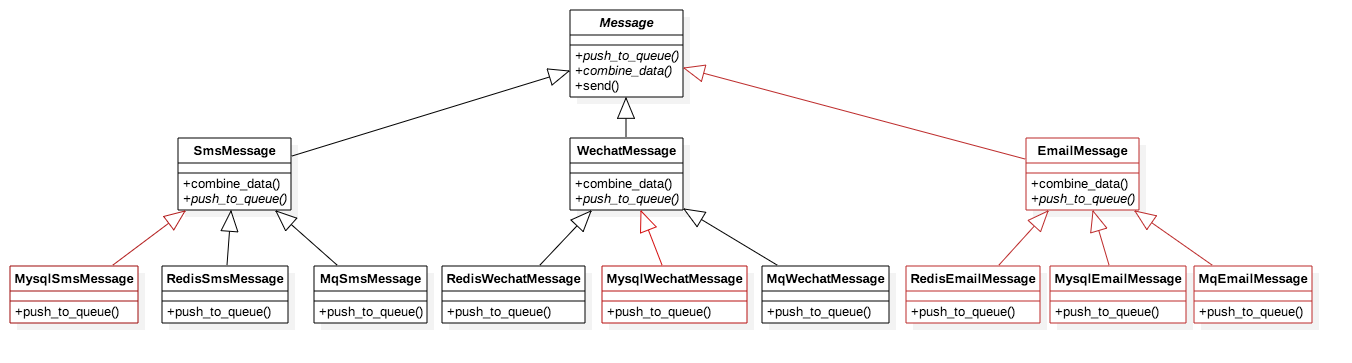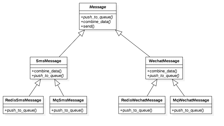 变化的点有2个:一个是消息类型[Sms、Wechat...],一个是发送方式[redis、mq...]。