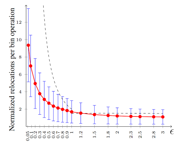 红色曲线代表移动的平均次数,蓝色柱线代表不同 ε 值(X 轴)的方差。虚线代表我们的理论结果所建议的上限,其非常适合用于预测实际的移动次数。此外,对于任何 ε 值,我们知道,每个垃圾桶的负载至多是平均负载的 (1+ε) 倍。下面,我们看到不同值
