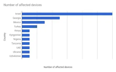 Chrysaor 从未在 Google Play 中发布,在 Google Play 之外的安装量也很少。据我们观察,在受到“验证应用”保护的逾 14 亿台设备中,只有不到 36 台受害设备安装了 Chrysaor。这些设备分布于以下国家/地区: