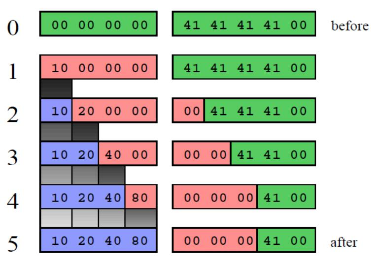 你可以在图一的第一行看到,所有八个字节都没有被我们的覆盖代码访问。从第二行开始,我们执行了四次覆盖,每一步都向右提升一个字节。最后一行展示了最终的预期状态:我们覆盖了foo数组的所有四个字节,但是这样做的时候,我们破坏了canary的三个字节。我们包含了canary数组,只是为了看到我们覆盖了不想覆盖的内存。