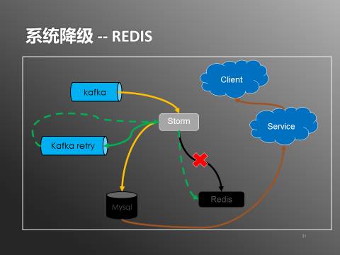 当mysql不可用时,通过打开db降级开关,storm会正常写入redis,但不再往mysql写入数据。数据进入reids就可以被查询服务使用,提供给客户端。另外storm会把数据写入一份到kafka的retry队列,在mysql正常服务之后,通过关闭db降级开关,storm会消费retry队列中的数据,从而把数据写入到mysql中。redis和mysql的数据在降级期间会有不一致,但系统恢复正常之后会通过retry保证数据最终的一致性。redis的降级处理也类似(如下图)