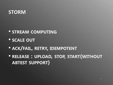 对当前系统来说,通过storm处理框架,消息能在进入kafka之后毫秒级别被处理。此外,storm具有强大的scale out能力。只要通过后台修改worker数量参数,并重启topology(storm的任务名称),可以马上扩展计算能力,方便应对突发的流量洪峰。