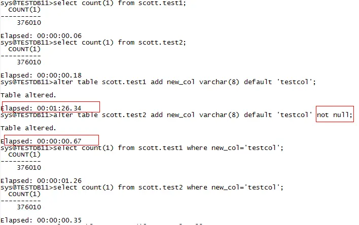 alter table scott.test1 add new_col varchar(8) default 'testcol';