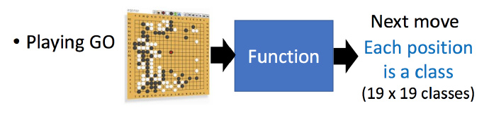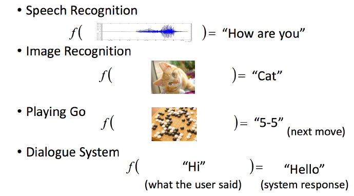 比如看下面例子:第一个是语音识别,假设我们想要找的function是输入一段语音,然后输出语音的文字。如果把世界上不同的句子当作一个类别,这样是没有办法穷举所有类型的,所以这种超越分类的问题,就需要另外一套完整的思想来解决。