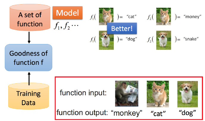 为了找到最好的函数 $f$ ,将训练集图像放入函数集的输入中,函数集输出识别结果。