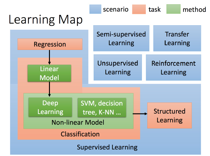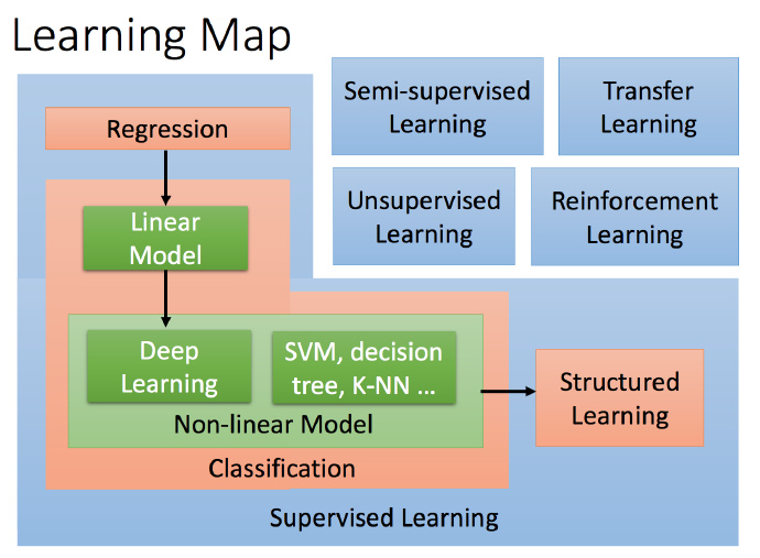 蓝色的都是代表Scenario(方案),红色部分指的是你要找的function的样子,可以在Semi-supervised Learning 的情况下做红色的task,也可以在 Transfer Learning下做红色task,就是右上角的4个虽然是小方块,但是 Supervised Learning 里面的 task 都可以在其他蓝色 scenario 中做。绿色的部分就是方法或者说模型,绿色的内容虽然写在 Classification 里面,但是可以放在 Regression 或者 Structured Learning 中。