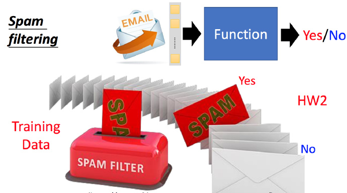 比如垃圾邮件过滤,就是要找到一个Function,输入为一封邮件,输出是二元的,是或者不是垃圾邮件。训练集就是很多封邮件,每一封邮件知道它是否是垃圾邮件,让Function进行学习。