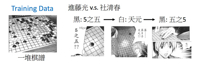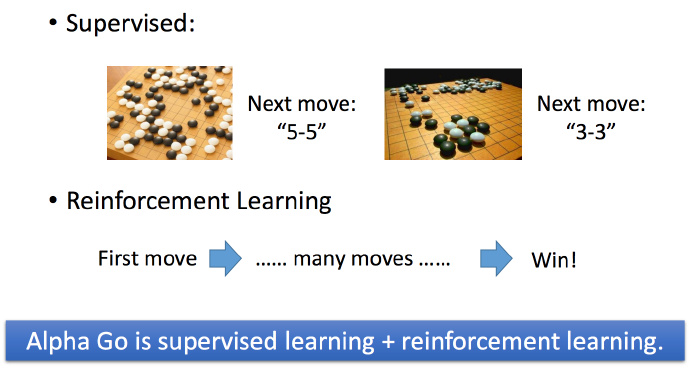 再举一个围棋的例子,比如 Supervised 情况就是机器看到一个棋局,告诉它下一步应该走什么。Reinforcement 的情况就是走了很多步,输了或者赢了,就是知道一个结果。AlphaGo 就是两个都用到了,先看棋谱学习,但是棋谱的数量是有限的,然后再进行增强型学习。所以 AlphaGo 第一轮和世界高手对局时还捉襟见肘,第二轮就基本横扫了。