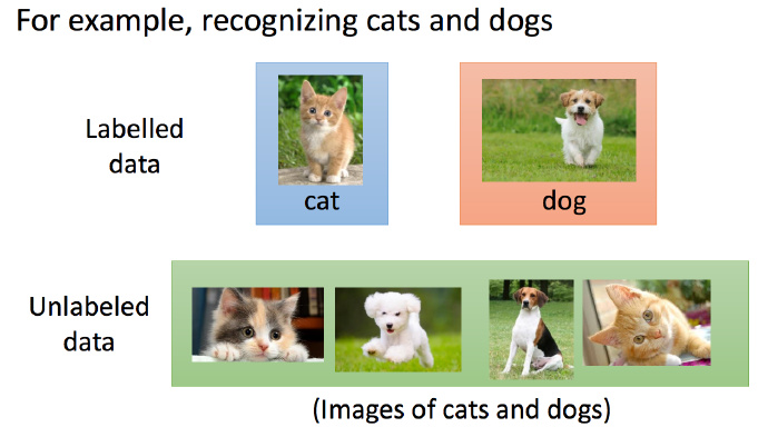比如图像识别一些猫和狗,Labelled data 就是训练集中每个图片知道它对应的是什么类型。而Unlabelled data 就是不知道图片对应的类型。这种其实也是可以让机器学习的比较好的,后面也会介绍。