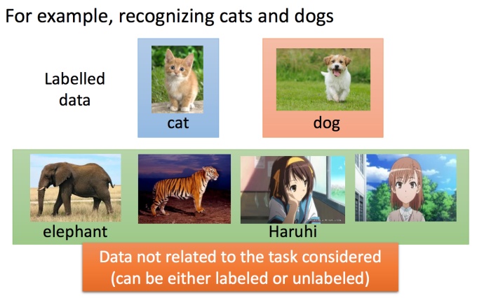 比如有 Labelled data ,但我们还有一些labelled 或者 unlabelled 数据,这些数据和 Labelled data 中识别猫和狗都没有关系,但它也是怎么帮助Labelled data 更好的识别。这就是 Transfer Learning 要做的事情。