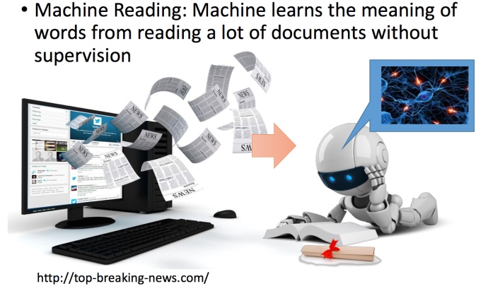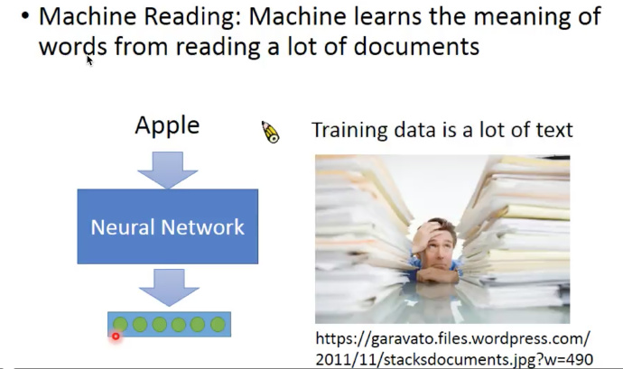 举一个Unsupervised Learning 的例子:让机器阅读非常多的文章,然后机器就可以学习单词的含义。