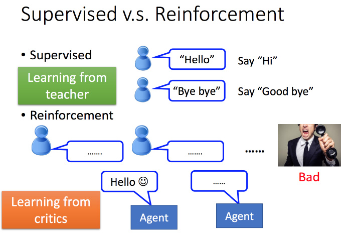 举例来比较 Supervised 和 Reinforcement:比如学习对话,Supervised 训练集每句话,都有对应的输出;但是Reinforcement就只是不断的对话,机器只能知道它做的好或者不好,没有其他更多的信息。