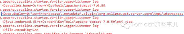 上面这张图中,-D后面是JVM启动时传递的参数,其中catalina.base,是代表Tomcat具体执行时,所有这些配置文件一类的资源具体查找的路径,所有这些配置,在Tomcat启动后,都会被解析得到,所以这些独立位置的配置文件才能生效。