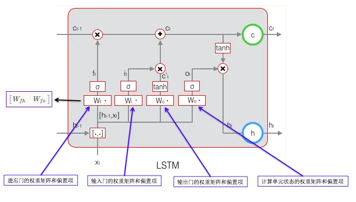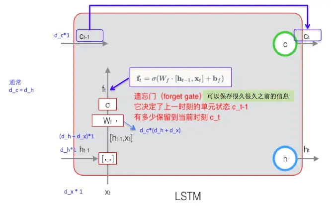 遗忘门的计算公式中:W_f 是遗忘门的权重矩阵,[h_t-1, x_t] 表示把两个向量连接成一个更长的向量,b_f 是遗忘门的偏置项,σ 是 sigmoid 函数。