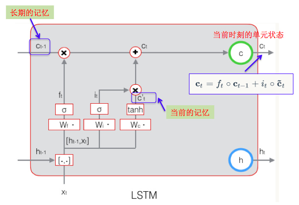 这样,就可以把当前的记忆 c_t 和长期的记忆 c_t-1 组合在一起,形成了新的单元状态 c_t。