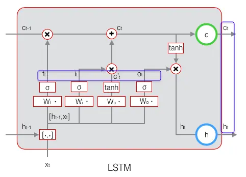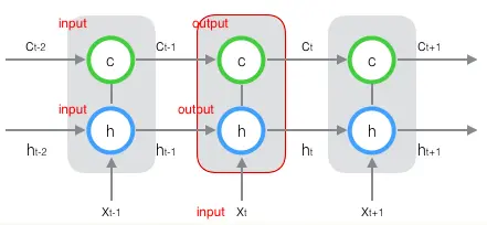 LSTM 的输出有两个:当前时刻 LSTM 输出值 h_t、和当前时刻的单元状态 c_t.