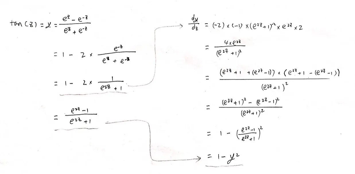 gate 的激活函数定义为 sigmoid 函数,输出的激活函数为 tanh 函数,导数分别为:
