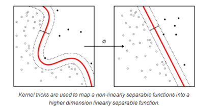 当类别不能被线性分离时,内核技巧就可以将非线性的可分离空间映射到高维的线性可分离空间。