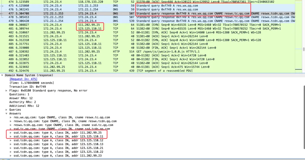 比如从图中可以看到 res.wx.qq.com 这个域名解析出了一大堆 IP 地址,而真正使用的仅有前两个。