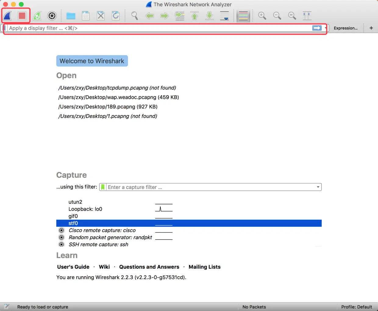 不过不用太急,我们要用到的东西不多,顶部红框里的蓝色鲨鱼标志表示开始监听网络数据,红色按钮一看也能猜出来是停止录制。与 Charles 只监听 HTTP 请求不同的是,WireShark 可以调试到 IP 层甚至更细节,所以它的数据包也更多,几秒钟的时间就会被上千个请求淹没,所以我建议用户略微控制一下监听的时长,或者我们可以在第二个红框中输入过滤条件来减少干扰,这个下文会详细介绍。