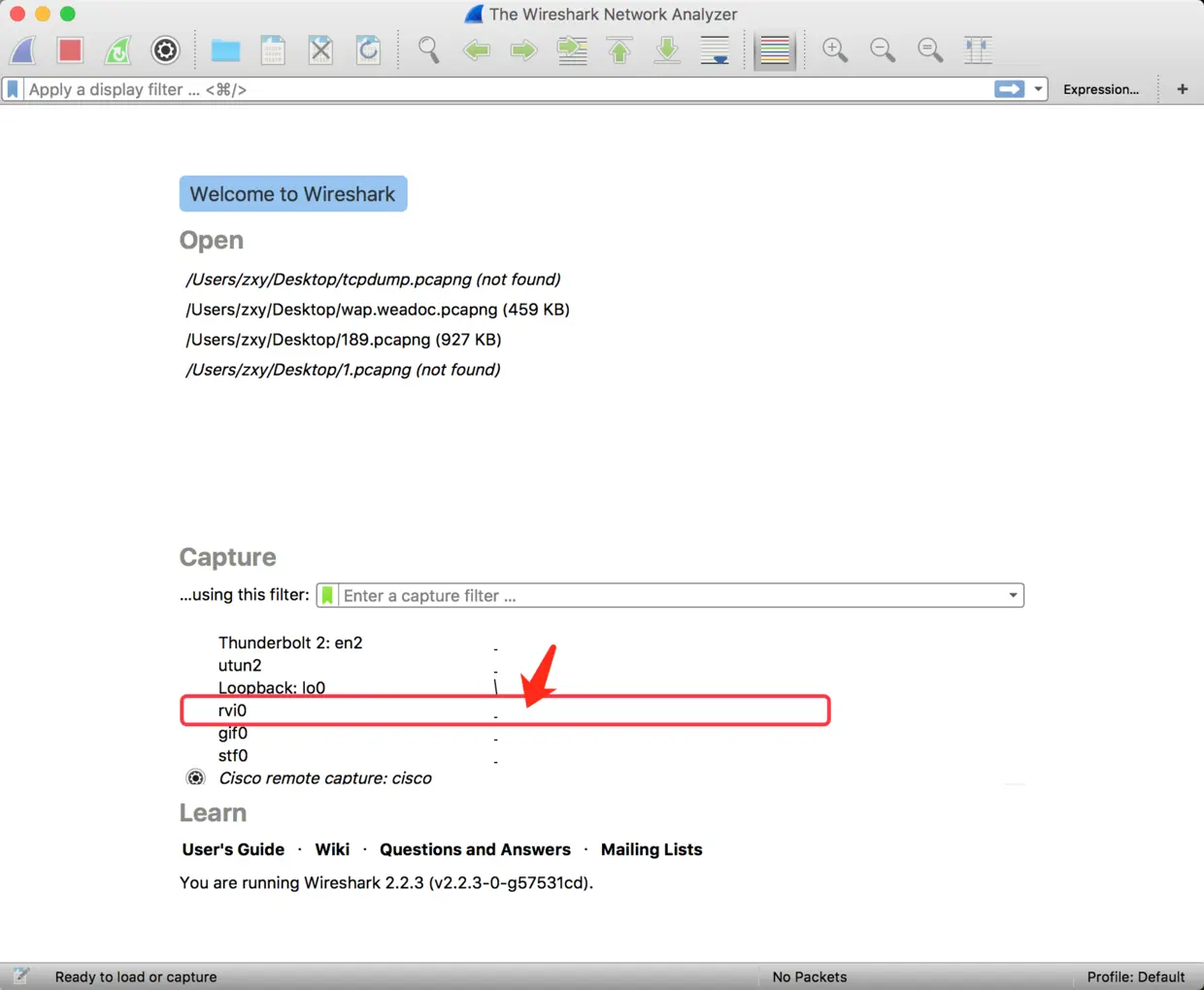 运行命令后会看到成功创建 rvi0 虚拟网卡的提示,双击 rvi0 那一行即可。