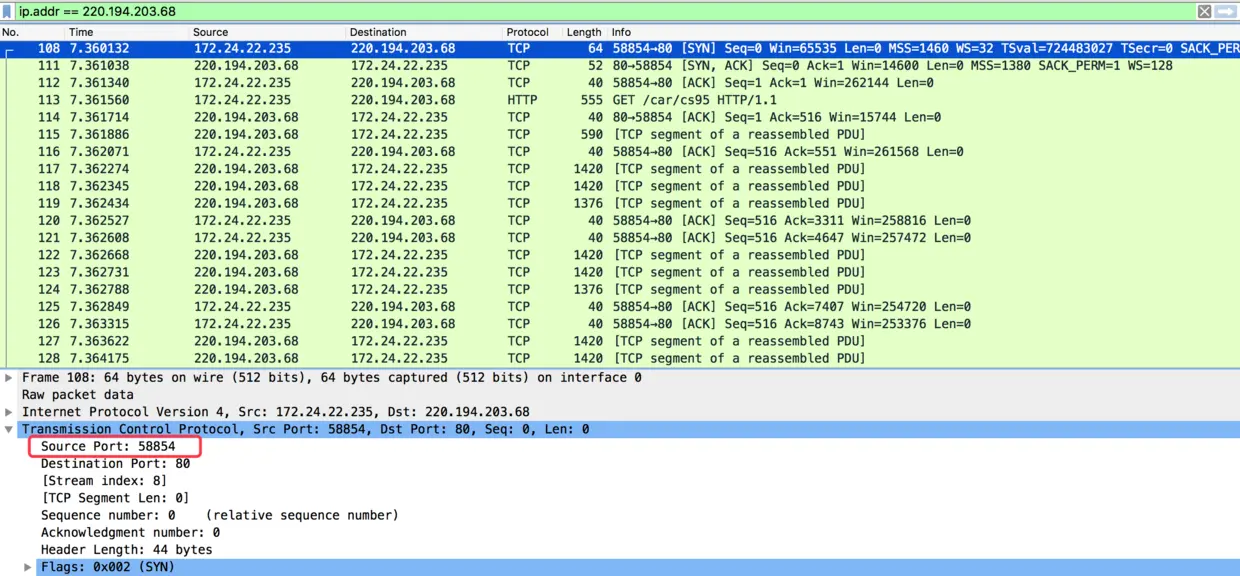 这样就只显示和 220.194.203.68 主机之间的通信了。注意红框中的 SourcePort,这是客户端端口。我们知道 HTTP 支持并发请求,不同的并发请求肯定是占用不同的端口。所以在图中看到的上下两个数据包,并非一定是请求与响应的关系,他们可能属于两个不同的端口,彼此之间毫无关系,只是恰好在时间上最接近而已。