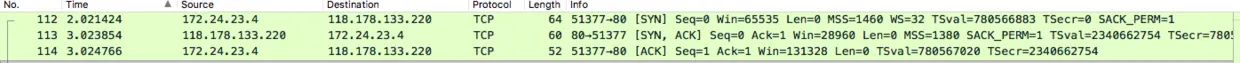 下图是一次典型的 TCP 握手时的场景。同时也可以看到第一张图中的 SYN 握手包发出后,过了一秒钟才接受到 ACK。当然了,原因也不清楚,只能解释为网络抖动。