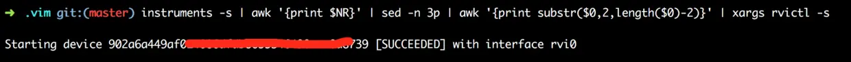 instruments -s | awk '{print $NF}' | sed -n 3p | awk '{print substr($0,2,length($0)-2)}' | xargs rvictl -s这样只要连上手机,就可以直接获取到 UDID 了。