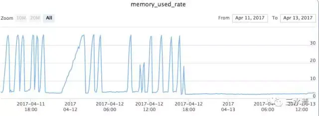 从上线之后,内存积累到一定时间就飙升,内存飙升同时,CPU也进行飙升,具体曲线如下: