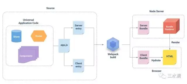 - webpack会根据server-entry.js和client-entry.js打包出来两个文件:server-bundle和client-bundle