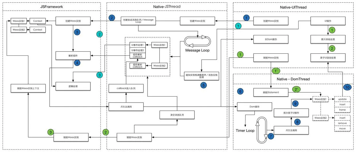 中间涉及到了3个子线程,mainThread,com.taobao.weex.component,com.taobao.weex.bridge,分别是UI主线程,DOM线程,JSbridge线程。