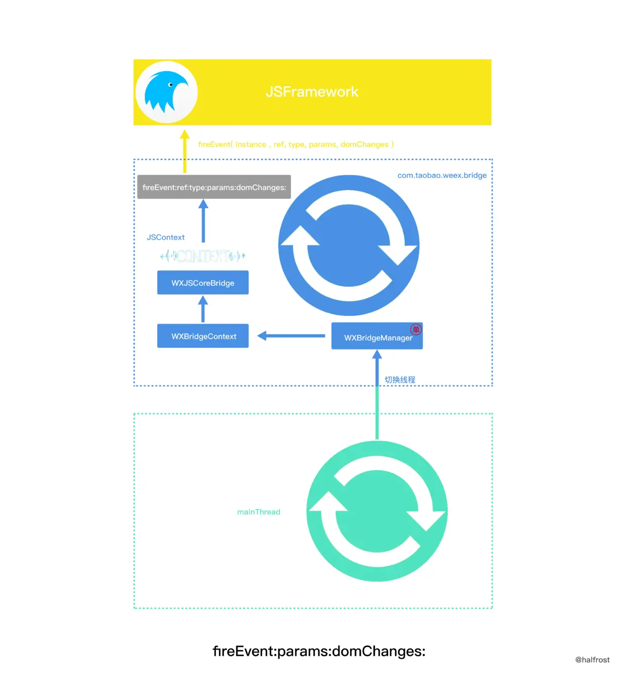 }入参ref, type, params, domChanges封装到最终的args参数数组里面,最后会封装出WXCallJSMethod方法,通过WXBridgeManager的callJsMethod调用到JS的fireEvent方法。
