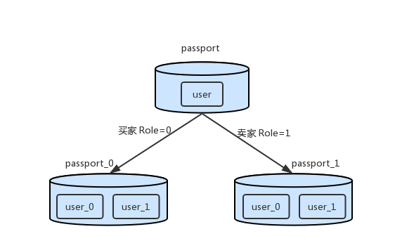 在Simple-Sharding的Unit Test中建立了这样一个数据模型:在passport库中有user表,user表分买家(Role为0)和卖家(Role为1),user表有id、name、role等必要的字段。传统的场景是passport库中只有一个user表,现在根据需求做分库分表,一种比较合理的方案是按买家和卖家来分库,每个库再做分表,于是逻辑架构如下图所示: