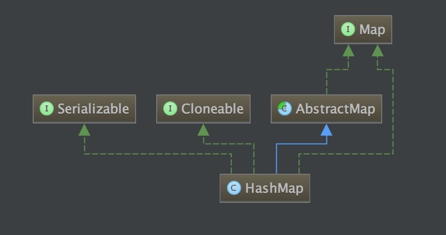HashMap实现了Map接口,Map接口设置一系列操作Map集合的方法,如:put、get、remove...等方法,而HashMap也针对此有其自身对应的实现。