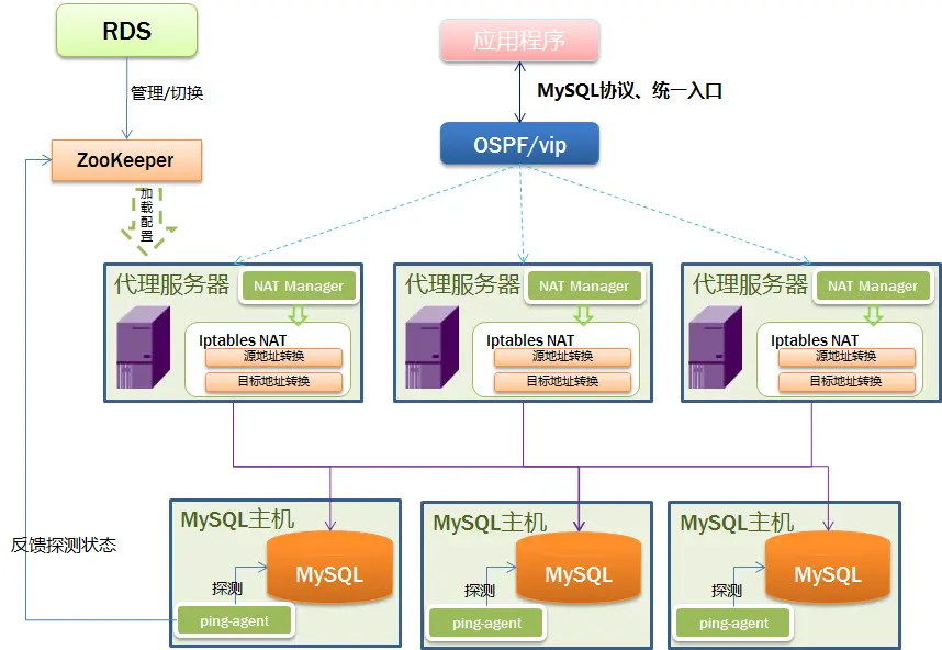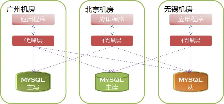 从上图可以看出,应用程序永远也不再需要考虑多机房高可用、负载均衡、读写分离的问题。而且由于代理层实现了高可用功能,一旦发现主写MySQL故障,会自动把主读切换为主写,从而在秒级实现FAILOVER。