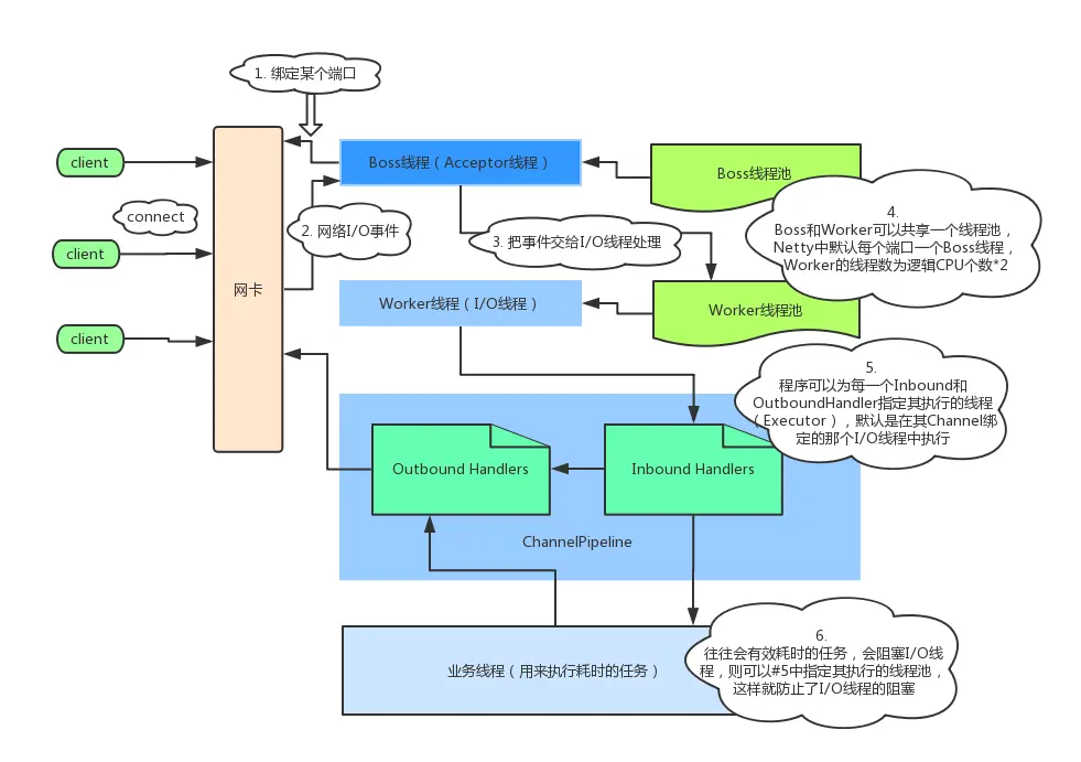 io.netty.util.concurrent.DefaultEventExecutorGroup),将耗时的Handler放入其中执行。 - 对于没有指定EventExecutorGroup的Handler,将默认指定为Channel上绑定的EventLoop。