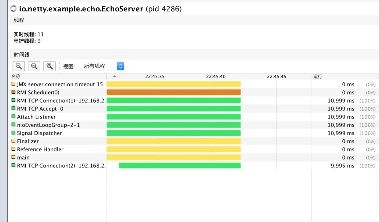 我在自己的电脑上运行Netty4中自带的Echo的例子,使用VisualVM查看其线程列表,截图如下: