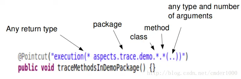 Pointcut:告诉代码注入工具在哪里注入特定代码的表达式(即需要在哪些Joint point应用特定的Advice)。它可以选择一个这样的点(例如,一个单一方法的执行)或者许多相似的点(例如,所有被自定义注解@DebugTrace标记的方法)。