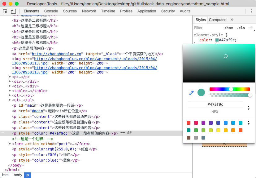 <p style="color:blue;">蓝色</p>如果对颜色没有准确的把握,可以在需要控制颜色的地方打开开发者工具,点击右边对应的色块,交互式地进行调整直到满意。