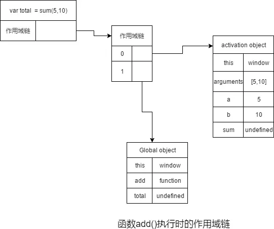 所以当sum函数执行的时候,即var total = sum(5,10)的时候,其全新的作用域链将如下图所示: