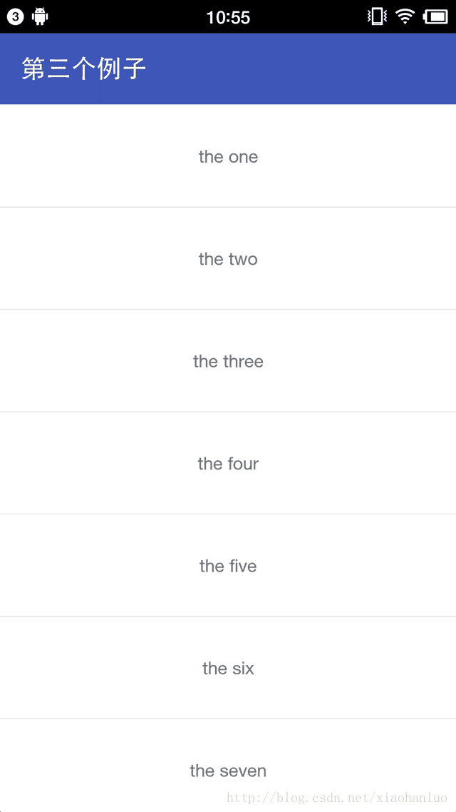 第三个例子是很久的开源项目,不同于前两种实现方式,前面两种都是自定义一个父布局,然后将刷新头部和列表放入其中,第三个例子是直接将刷新头部放在列表ListView的头部,然后动态的设置刷新头部的高度,达到下拉刷新的效果。