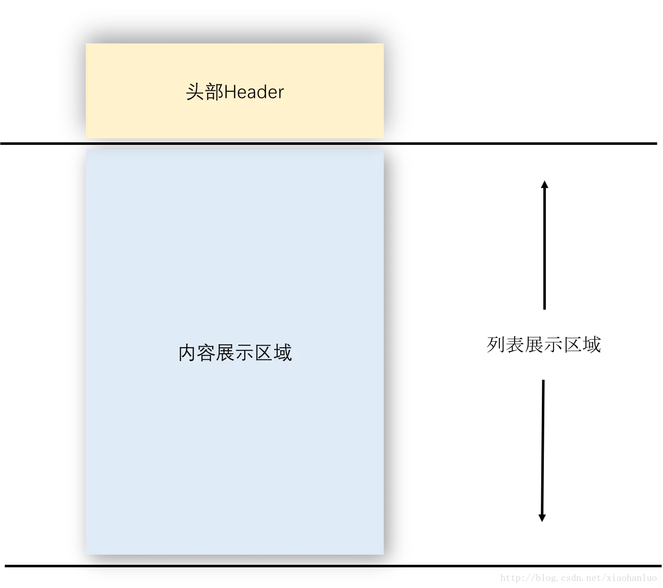 下拉刷新主要分为两部分,一部分是刷新头部Header,一部分是内容展示区域,一般是列表。通过某些方法,来控制刷新头部Header的展示范围,达到下拉刷新的效果,如下图。