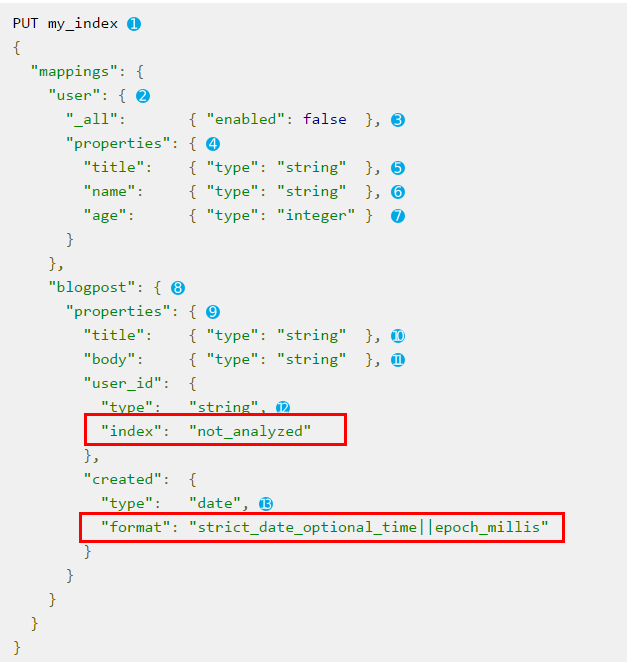 下面是创建mapping的例子,这个例子在my_index这个目录下,为user、blogpost这些type创建了mapping。其中properties下面是各种字段的定义,包括了string、数值、日期等类型的定义。