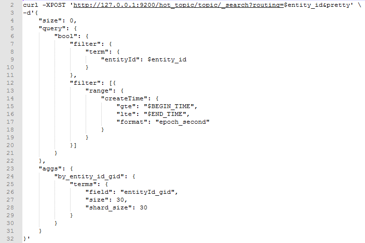 ES经常为人诟病的一个地方是建索引比较慢,10亿数据的索引构建时间要花几天。这也容易理解,天下没有免费的午餐,读写的性能往往是互斥的,快速读取和检索意味着大量索引和辅助数据的预先建立,那写入时势必会慢。如何取舍,需要看实际的业务场景而定了。下面就是建好索引后,去聚合某论坛内指定时间段内Top帖子的接口调用方式。