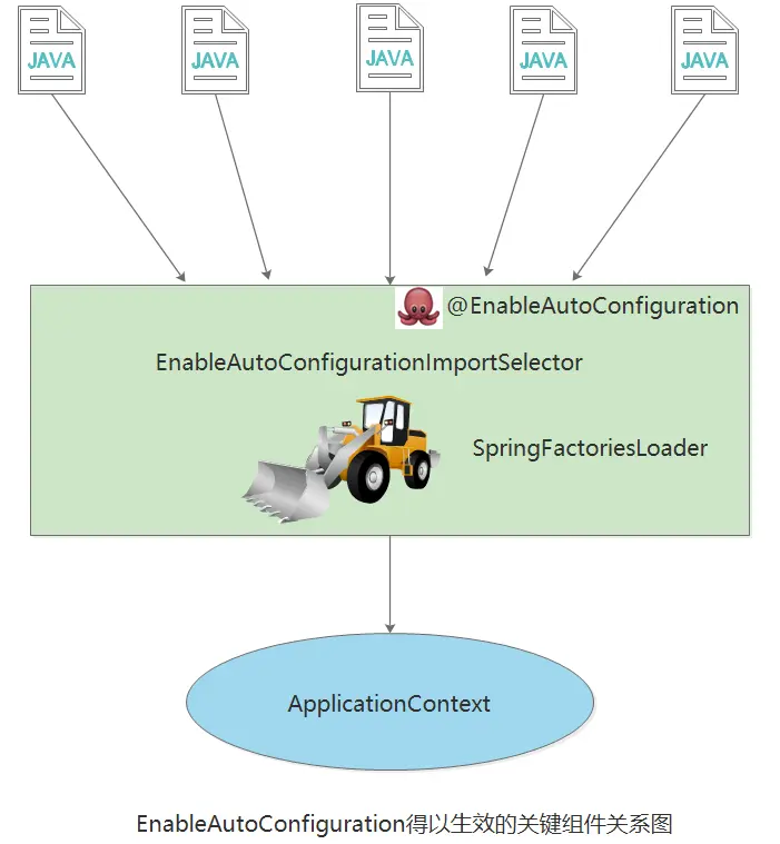 }其中,最关键的要属@Import(EnableAutoConfigurationImportSelector.class),借助EnableAutoConfigurationImportSelector,@EnableAutoConfiguration可以帮助SpringBoot应用将所有符合条件的@Configuration配置都加载到当前SpringBoot创建并使用的IoC容器。就像一只“八爪鱼”一样