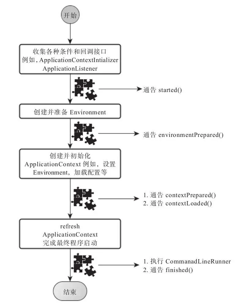 2) SpringApplication实例初始化完成并且完成设置后,就开始执行run方法的逻辑了,方法执行伊始,首先遍历执行所有通过SpringFactoriesLoader可以查找到并加载的SpringApplicationRunListener。调用它们的started()方法,告诉这些SpringApplicationRunListener,“嘿,SpringBoot应用要开始执行咯!”。