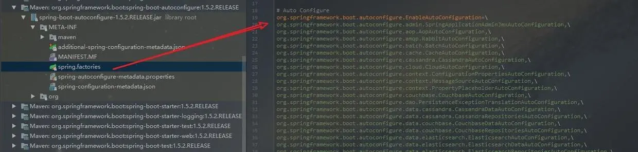 }配合@EnableAutoConfiguration使用的话,它更多是提供一种配置查找的功能支持,即根据@EnableAutoConfiguration的完整类名org.springframework.boot.autoconfigure.EnableAutoConfiguration作为查找的Key,获取对应的一组@Configuration类